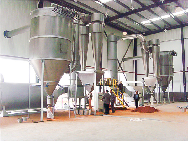 热空气切线进入干燥器底部,在搅拌器带动下形成强有力的旋转风场。膏状物料由螺旋加料器进入干燥器内,在高速旋转搅拌桨的强烈作用下,物料受撞击、磨擦及剪切力的作用下得到分散,块状物料迅速粉碎,与热空气充分接触、受热、干燥。脱水后的干物料随热气流上升,分级环将大颗粒截留,小颗粒从环中心排出干燥器外,由旋风分离器和除尘器回收,未干透或大块物料受离心力作用甩向器壁,重新落到底部被粉碎干燥。