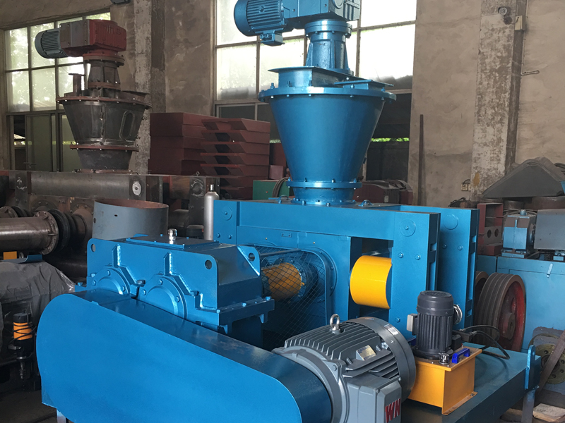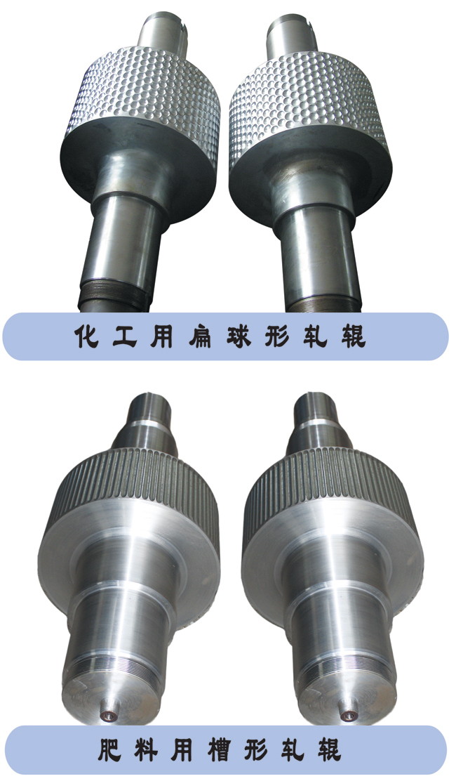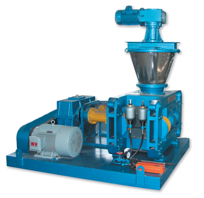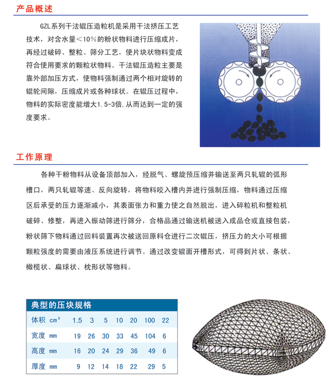 各种干粉物料从设备顶部加入,经脱气、螺旋预压缩并输送至两只轧辊的弧形槽口,两只轧辊等速、反向旋转,将物料咬入槽内并进行强制压缩,物料通过压缩区后承受的压力逐渐减小,其表面张力和重力使之自然脱出,进入碎粒机和整粒机破碎、修整、再进入振动筛进行筛分,合格品通过输送机被送入成品仓或直接包装,粉状筛下物料通过回料装置再次被送回原料仓进行二次辊压,挤压力的大小可根据颗粒强度的需要由液压系统进行调节。通过改变辊面开槽形式,可得到片状、条状、橄榄状、扁球状、枕形状等物料。