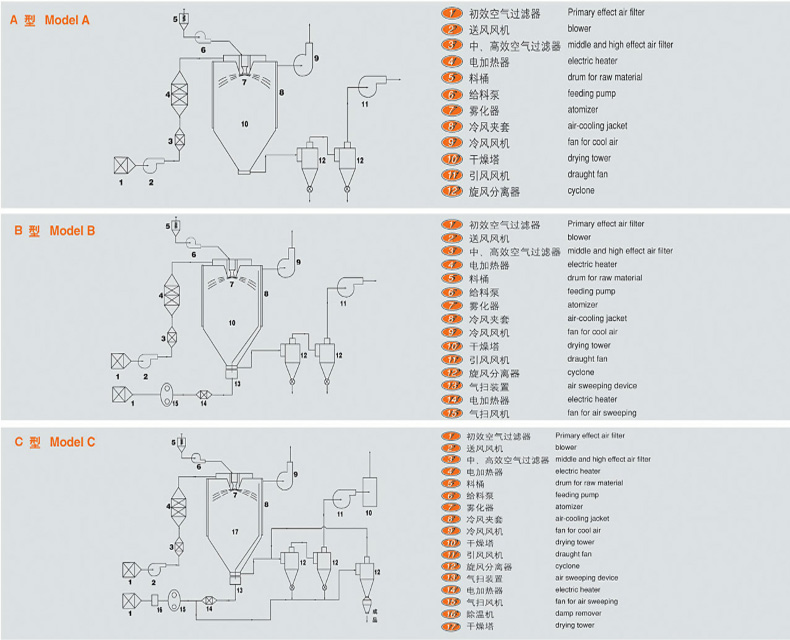 该机采用全封闭形式,所有部件均采用不锈钢制造,配有三级净化装置,过滤后的空气达十万级要求.筒体装有冷壁装置,使壁温<80℃,物料在壁上停留也不焦化变质现象,大大增加了收粉率(达95%以上),而且不会产生混药现象和粘壁现象。