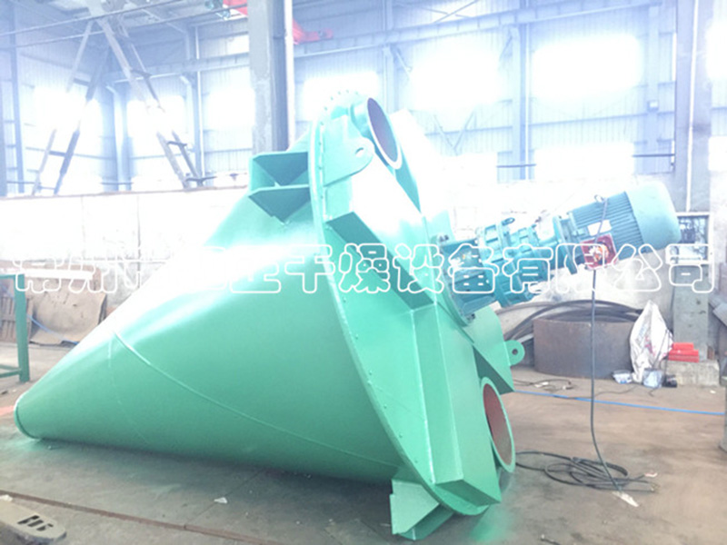 DSH系列的双螺旋锥形混合机筒内两只非对称螺旋自转将物料向上提升,转臂慢速公转运动;使螺旋外的物料,不同程度进入螺柱,从而达到全圆周方位物料的不断更新扩散,被提到上部的两股物料再向中心凹穴汇合,形成一股向下的物料流,补充了底部的空缺,从而形成对流循环的三重混合效果;标准型锥形螺旋混合机有两根搅拌螺旋,实际应用中根据设备规格大小可以采用单(一根长螺旋)、双(长短各一两根不对称螺旋)、三(两短一长对称布置)根螺旋;理论上搅拌螺旋越多,混合效果越好;设备一般采用梅花状“错位阀”,此阀与长螺旋底部贴合紧密,有效减少混合死角,驱动形式有手动和气动可选;根据用户需要,也可加装蝶阀、球阀、星形卸料器、边出料等。